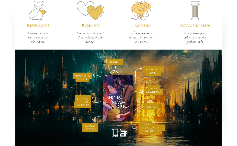 Hora da Névoa de Ouro é uma fantasia urbana que mistura romance, aventura, mistério e autodescoberta – ideal para leitores que se apaixonaram por sagas como Harry Potter, Trono de Vidro, Sombra e Ossos.