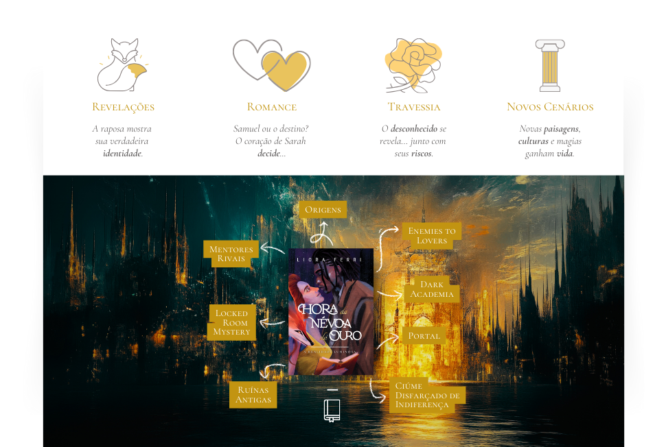 Hora da Névoa de Ouro é uma fantasia urbana que mistura romance, aventura, mistério e autodescoberta – ideal para leitores que se apaixonaram por sagas como Harry Potter, Trono de Vidro, Sombra e Ossos.